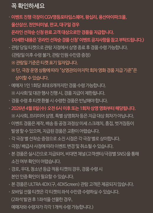 CGV 이벤트 상영관 중 영등포타임스퀘어, 왕십리, 용산아이파크몰 지점은 '온라인 선착순 경품 신청 완료 고객'에게만 특전을 지급합니다. 따라서 미리 신청하셔서 특전을 수령하실 수 있습니다. 그 외의 CGV 이벤트 상영관인 홍대 지점은 '별도의 신청 없이 관람 후'에 특전을 수령하시면 됩니다.
